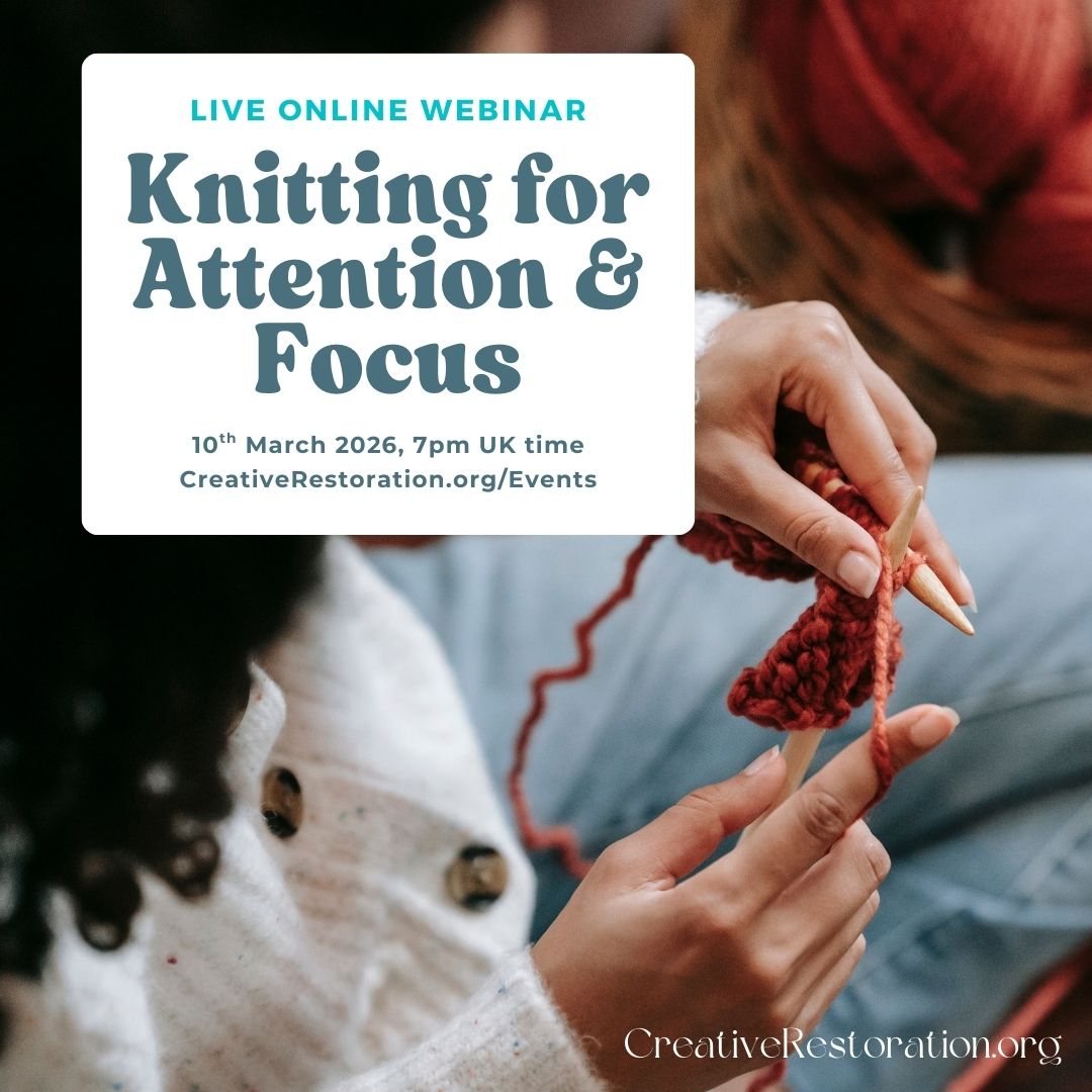 Knitting for attention and focus is a live webinar exploring how knitting and crochet can support concentration, attention and mindful awareness, particularly for people who struggle with restlessness, distractibility or overwhelm.